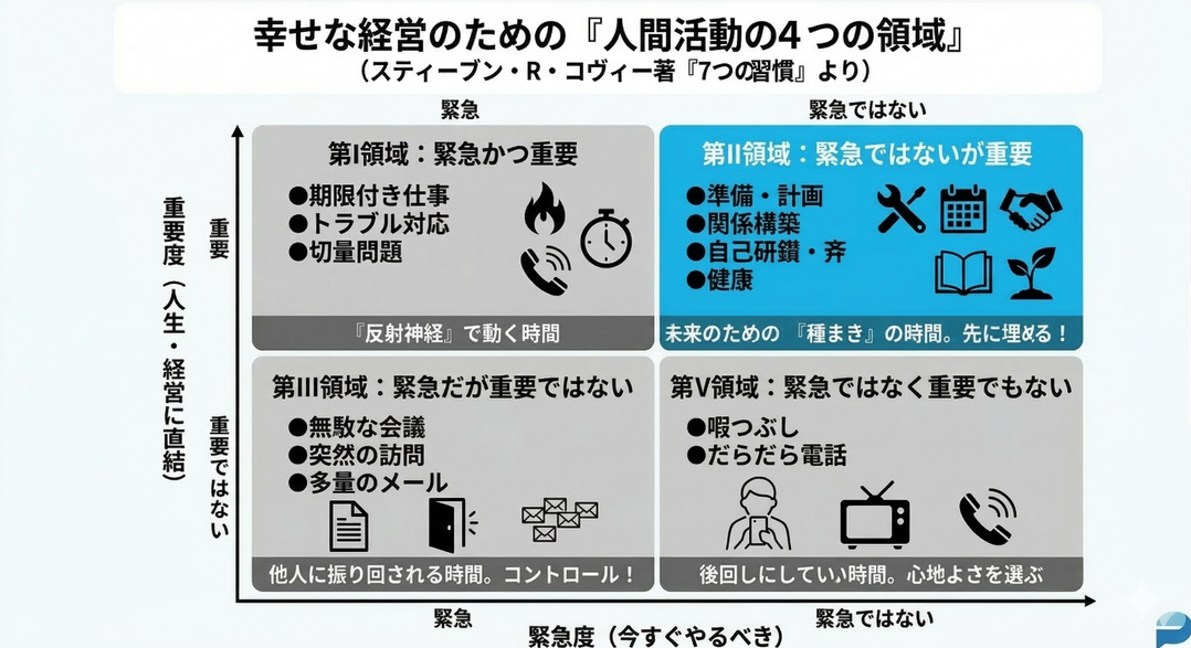 書籍の中では、私たちの人間活動の領域を「重要度」「緊急度」の4つに分けています。
