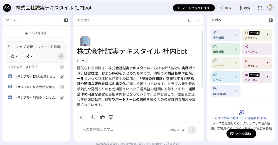実際に、私が作成した「株式会社 誠実テキスタイル」という架空の会社のマニュアルを読み込ませてみました。