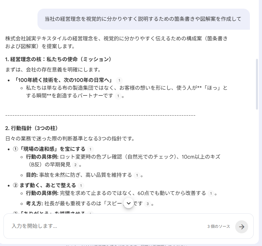 例えば「当社の経営理念を視覚的に分かりやすく説明するための箇条書きと図解案を作成して」と打ってみます。