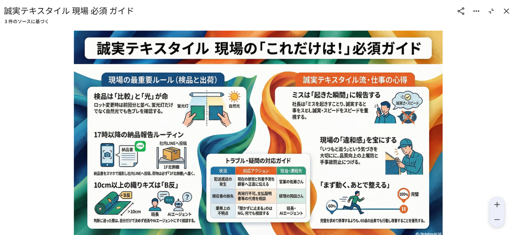 言葉では伝わりにくい数値やルールも、AIがビジュアル化してくれるので、新しく入った人も「何をすればいいか分からない」という孤独を感じずに、すぐに仕事に取り掛かれるのではないでしょうか?。