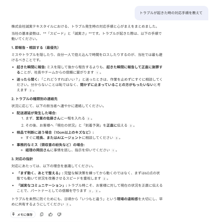 AI回答: 「当社の基本姿勢は、「スピード」と「誠実さ」です。トラブルが起きた際は、以下の手順で動いてください。」