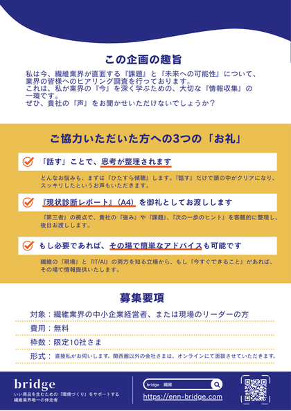 対象: 繊維業界の中小企業経営者様、または現場のリーダー様