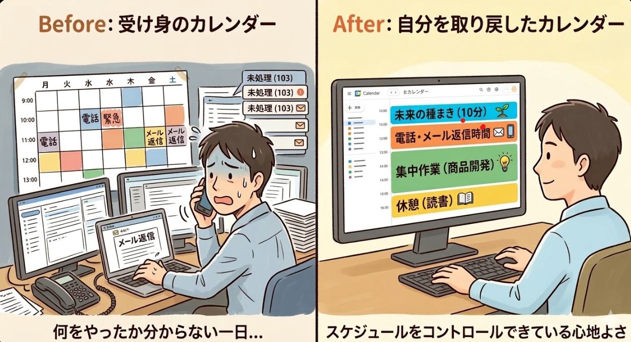 「未来のために重要なこと(でも緊急じゃないこと)」を、先にスケジュールに予約してしまうんです。