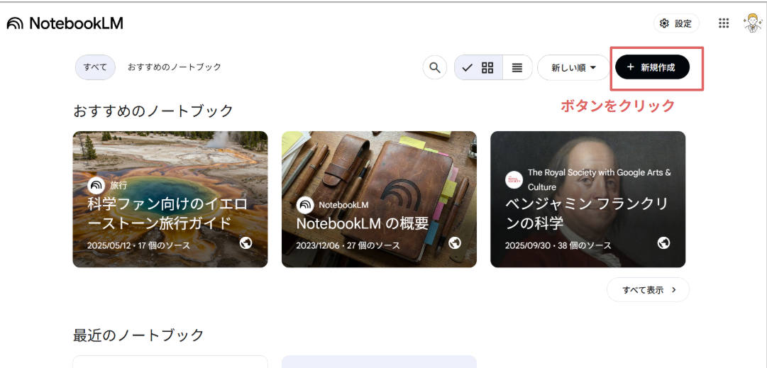 NotebookLM公式サイトにアクセスし、お手持ちのGoogleアカウントでログインして「新しいノートブック」を作成します。