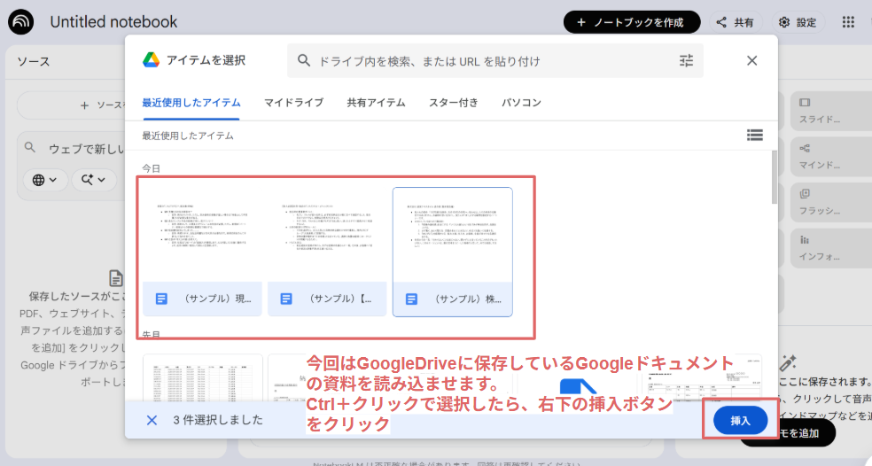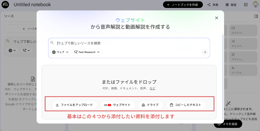 左側の「ソースを追加」から、お手持ちのPDFやGoogle ドキュメント、Google スプレッドシートなどを選択。