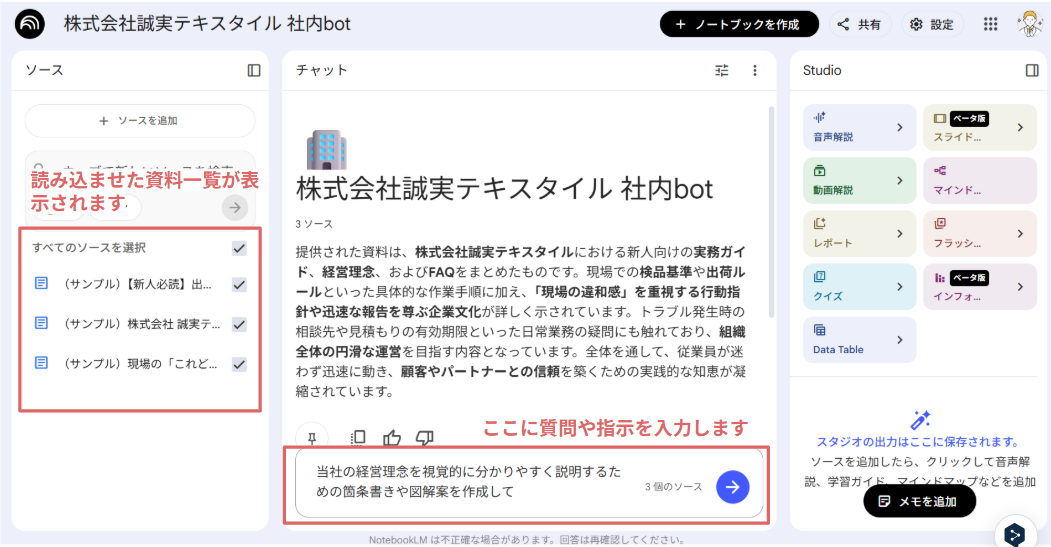 実際に、私が作成した「株式会社 誠実テキスタイル」という架空の会社のマニュアルを読み込ませてみました。