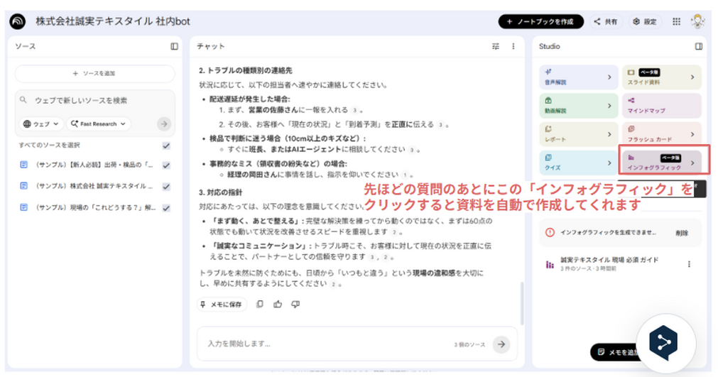 ↑でまとめてくれた回答が出来上がったら、↓画像の左端にある「インフォグラフィック」というボタンをクリックしてください